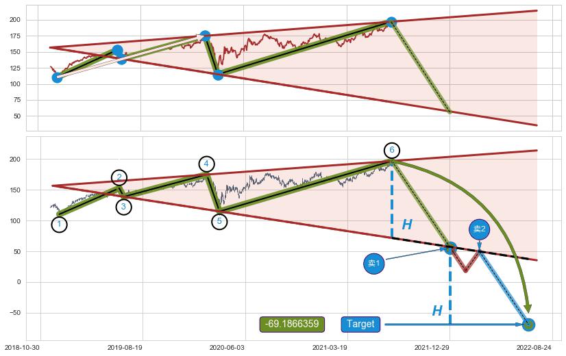 ➢ 最小反转跌幅→𝐇: 125.25 (逐步抬高阻力斜边最后的阻力点⑥与支撑边垂直距离)
