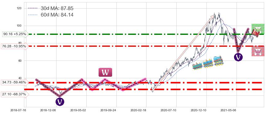 ♘ 阻力价格位90.16,可信任强度70.92%,距离最后交易2021-07-23形成的收盘价格85.66相差 +5.25%