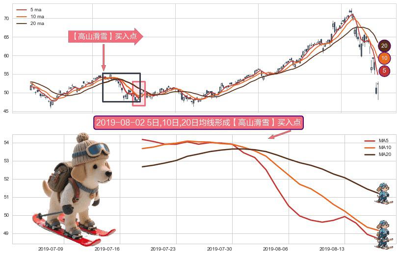 ⚀ 2019-07-18日-2019-08-16日显现 5日-10日-20日均线 【高山滑雪】买入点 看多信号,后市看涨,买入