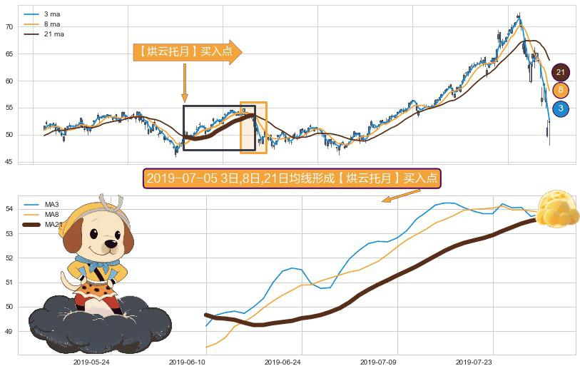 ⚀ 2019-06-10日-2019-07-31日显现 3日-8日-21日均线 【烘云托月】买入点 看多信号,后市看涨,买入