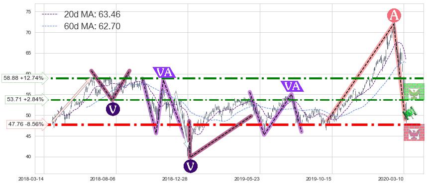 ♘ 阻力价格位58.88,可信任强度70.23%,距离最后交易2020-03-13形成的收盘价格52.23相差 +12.74%