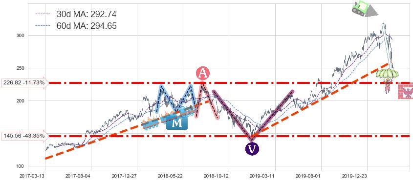 ♘ 支撑价格位226.82,可信任强度72.25%,距离最后交易2020-03-13形成的收盘价格256.95相差 -11.73%