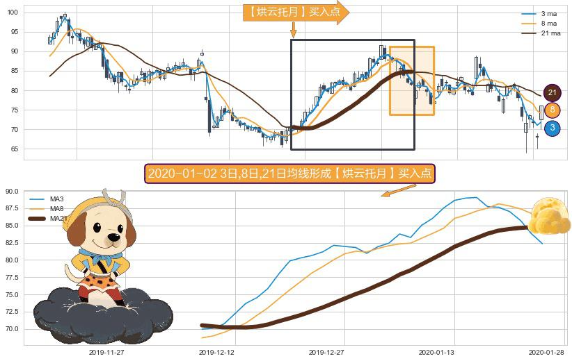 ⚀ 2019-12-09日-2020-01-24日显现 3日-8日-21日均线 【烘云托月】买入点 看多信号,后市看涨,买入