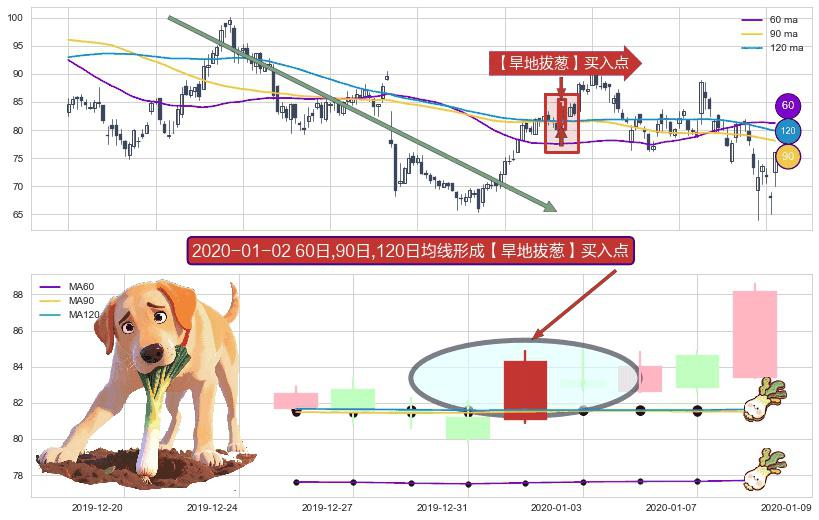 ⚀ 2020-01-02日显现 60日-90日-120日均线 【旱地拔葱】买入点 看多信号,后市看涨,买入
