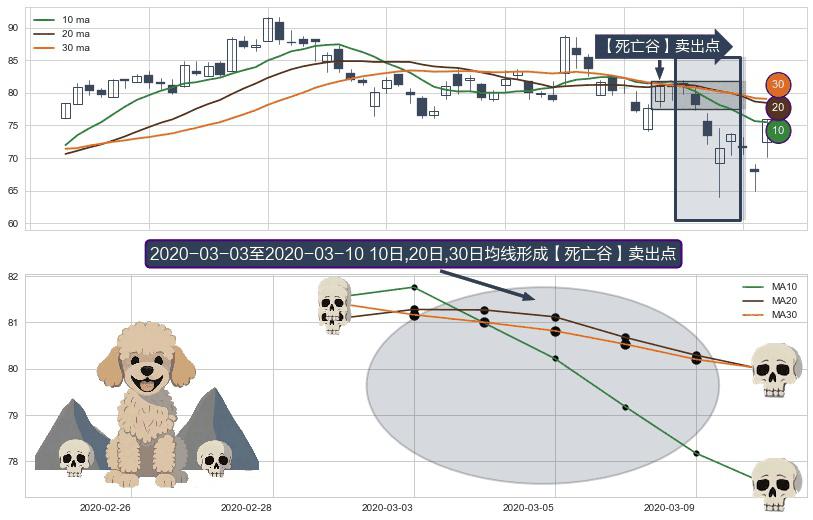 ⚂ 【死亡谷】卖出点 由MA10均线下穿MA20均线和MA30均线,MA20均线下穿MA30均线形成