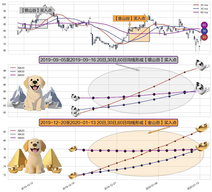 ⚃ 2019-12-23-日至2020-01-13-日显现 20日-30日-60日均线 【金山谷】买入点 其再次确认了买入信号,可靠性更强,买入