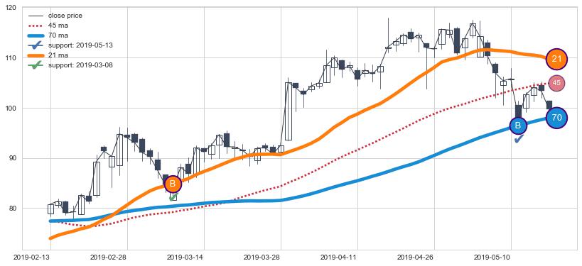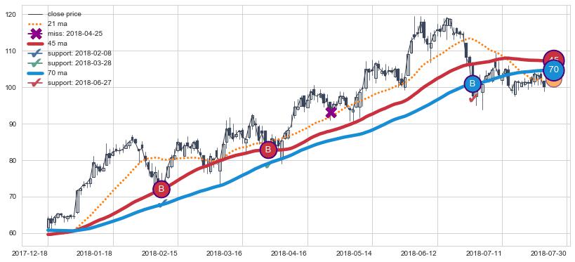 ⚁ MA3和MA8走势平行,且始终保持在短距离内,MA21始终在短中期均线下方,与短中期均线保持一定的距离,微微上行