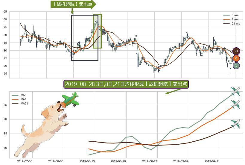 ⚀ 2019-08-12日-2019-09-13日显现 3日-8日-21日均线 【战机起航】卖出点 看空信号,后市看跌,卖出