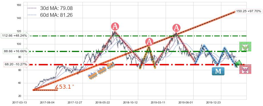 ♘ 支撑价格位68.20,可信任强度94.34%,距离最后交易2020-03-13形成的收盘价格76.00相差 -10.27%