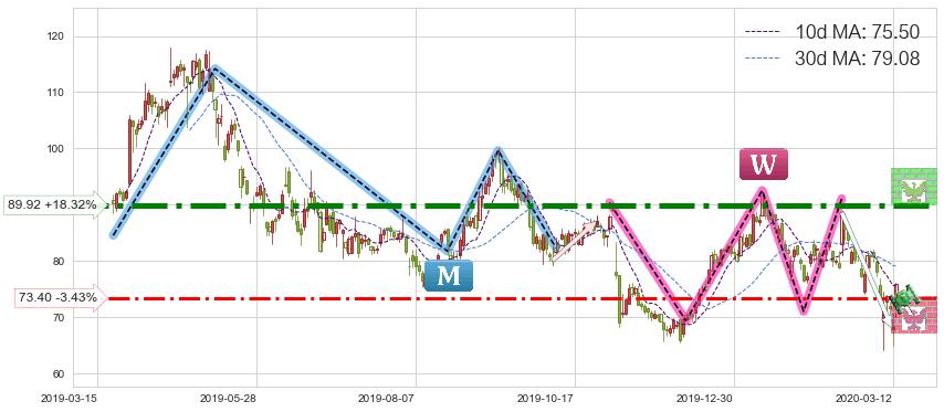 ♘ 阻力价格位89.92,可信任强度92.50%,距离最后交易2020-03-13形成的收盘价格76.00相差 +18.32%