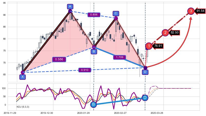 ➢ AI预测: 假定反转继续,第❶价格目标位置(2020-03-16, 76.91)