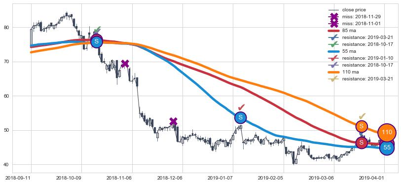 下跌趋势2018-09-11-2019-04-01,均线85, 110, 55确认关键阻力3处