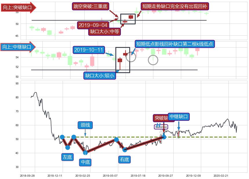 ➣ 普通缺口在【三重底】震荡整理形态中出现
