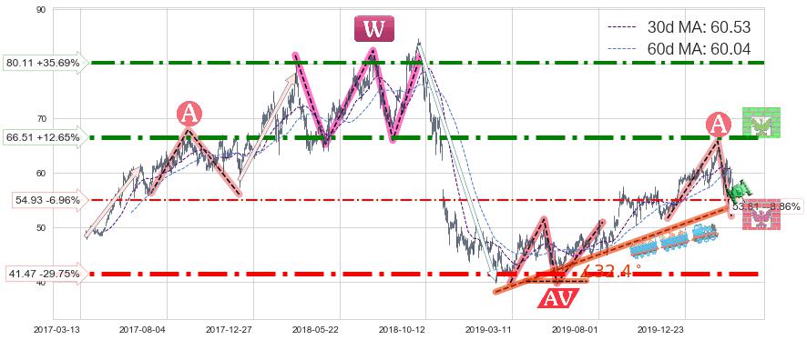 ♘ 支撑价格位54.93,可信任强度46.41%,距离最后交易2020-03-13形成的收盘价格59.04相差 -6.96%