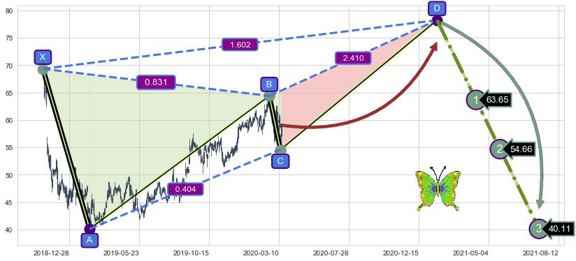 ➣ 未完成【蝴蝶】形态起点X: 2018-11-01, 已到达C点: 2020-03-12, 预测最终D点: 2021-01-20, 共565交易日