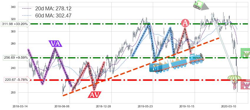 ♘ 支撑价格位220.67,可信任强度93.65%,距离最后交易2020-03-13形成的收盘价格234.22相差 -5.78%