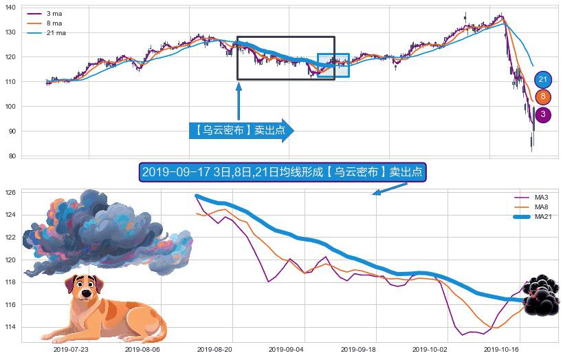 形态多维评估: ⚀ 2019-08-13日-2019-10-18日显现 3日-8日-21日均线 【乌云密布】卖出点 看空信号,后市看跌,卖出