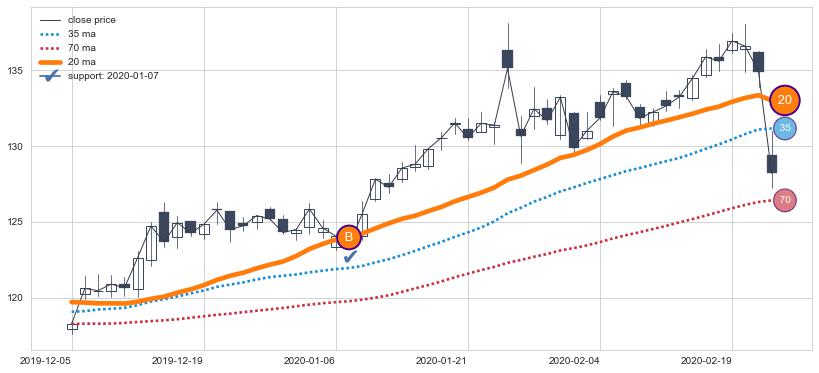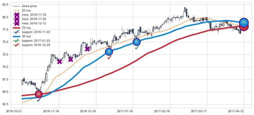 上涨趋势2016-10-21-2017-04-12,均线35, 70确认关键支撑3处