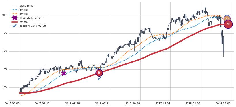 上涨趋势2017-06-06-2018-02-06,均线70确认关键支撑1处
