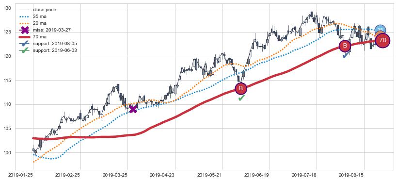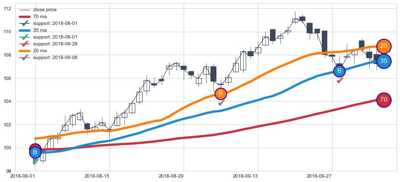 上涨趋势2018-07-17-2018-10-05,均线35, 20, 70确认关键支撑3处