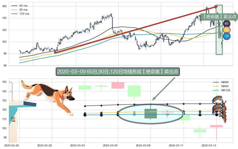 ⚀ 2020-03-09日显现 60日-90日-120日均线 【绝命跳】卖出点 看空信号,后市看跌,卖出