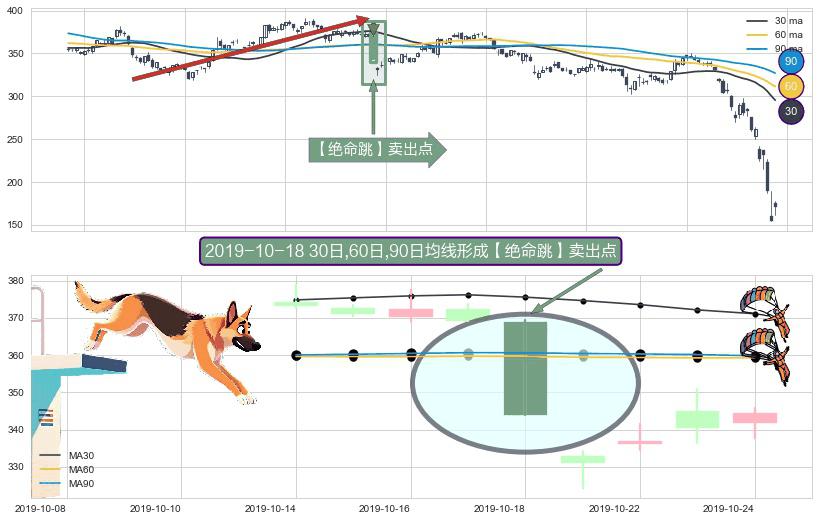 ⚀ 2019-10-18日显现 30日-60日-90日均线 【绝命跳】卖出点 看空信号,后市看跌,卖出