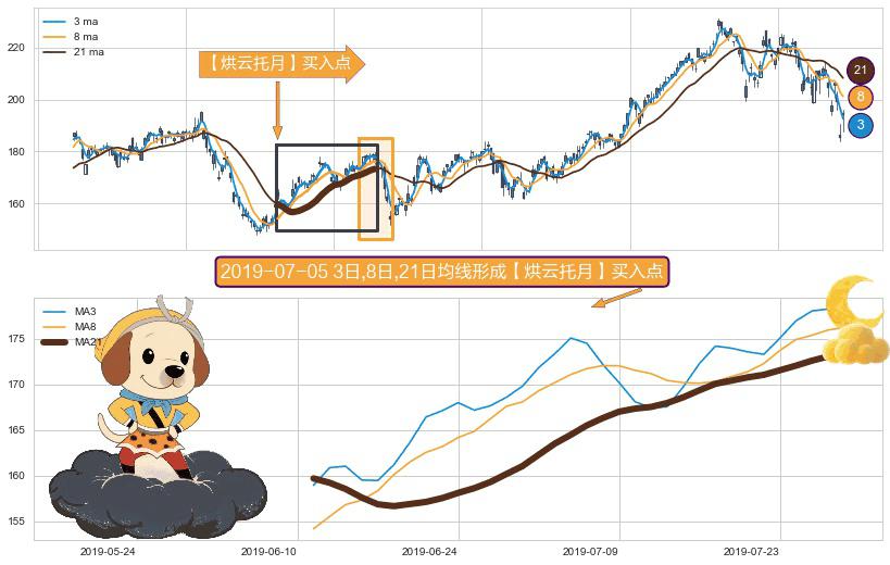 ⚀ 2019-06-11日-2019-07-29日显现 3日-8日-21日均线 【烘云托月】买入点 看多信号,后市看涨,买入