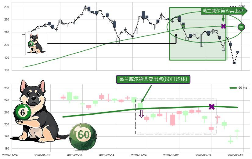 ⚀ 2020-02-21-日显现 葛兰威尔均线 60日均线 第⑥卖出点 走势反转见顶信号,后市看跌,卖出信号