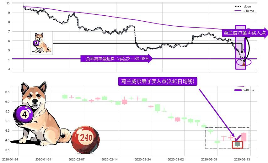 形态多维评估: ⚀ 2020-03-12-日显现 葛兰威尔均线 240日均线 第④买入点 下降趋势均值回复的短线反弹信号,后市看涨,买进信号