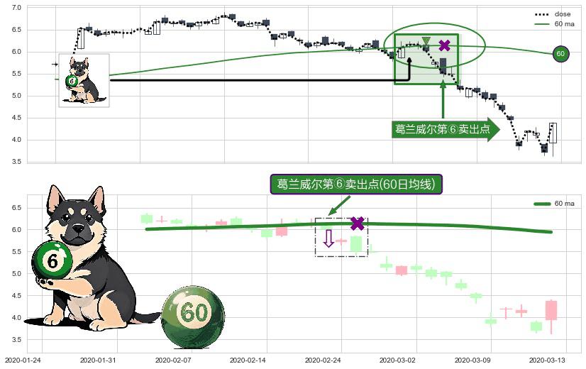 形态多维评估: ⚀ 2020-02-21-日显现 葛兰威尔均线 60日均线 第⑥卖出点 走势反转见顶信号,后市看跌,卖出信号