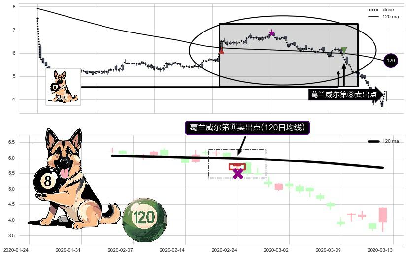 形态多维评估: ⚀ 2020-02-24-日显现 葛兰威尔均线 120日均线 第⑧卖出点 下降趋势的中继信号,后市看跌,卖出信号