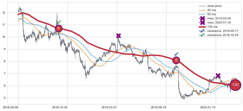 下跌趋势2018-06-08-2020-02-25,均线130确认关键阻力2处