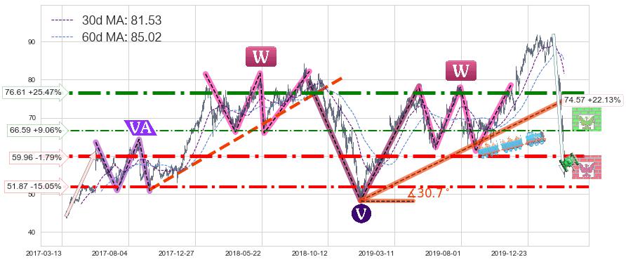 ♘ 阻力价格位66.59,可信任强度46.93%,距离最后交易2020-03-13形成的收盘价格61.06相差 +9.06%