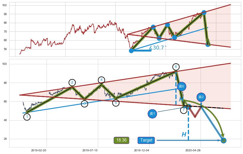 ➢ 最小反转跌幅→𝐇: 35.99 (逐步抬高阻力斜边最后的阻力点⑥与支撑边垂直距离)