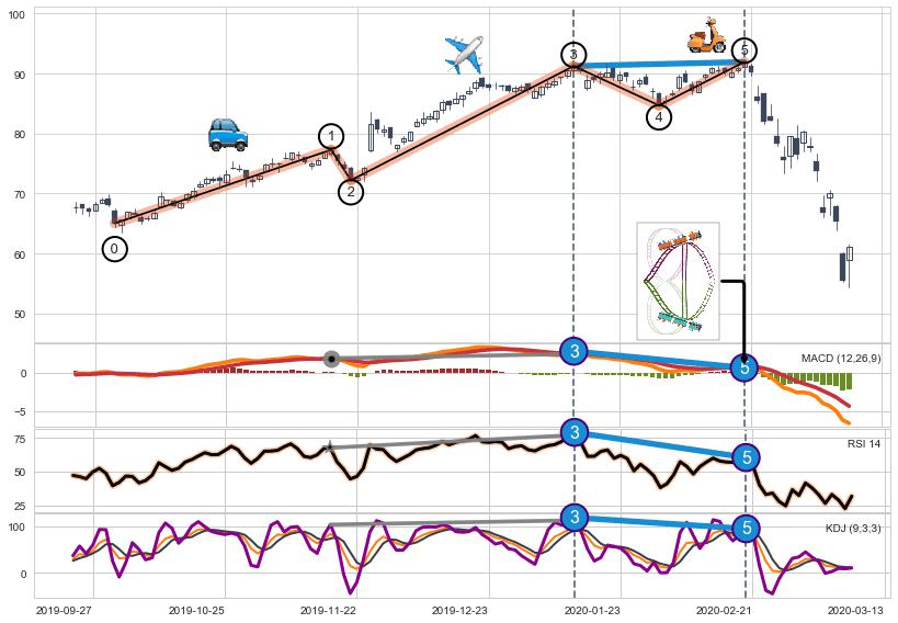 ➢ 1,3,5驱动浪MACD, RSI, KDJ走势都出现【常规背离】反转信号增强
