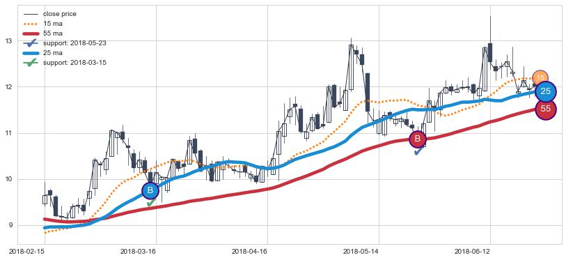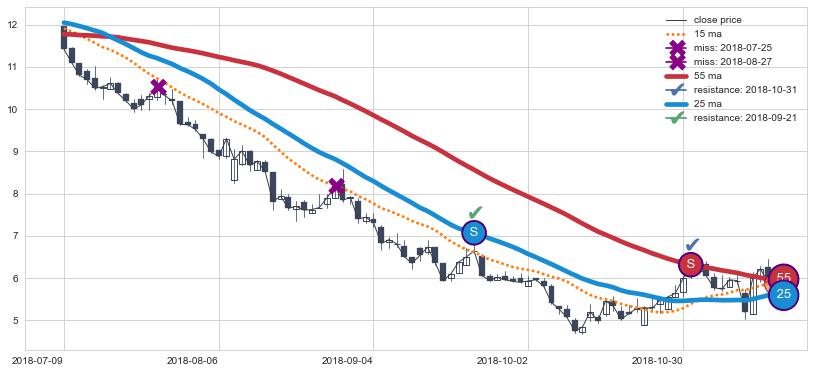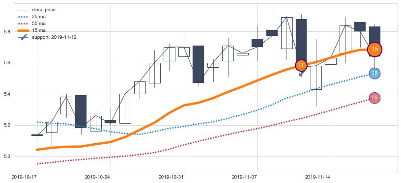 ⚃ 在破位点附近ma走势明显平稳迹象,稍后的走势中ma下垂迹象也出现,信号【可信度中等偏上】