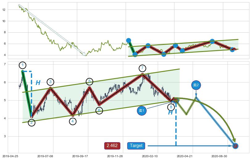 ➣ 支撑位【②④⑥⑧】波动逐渐走高,构成【旗形】上平行线