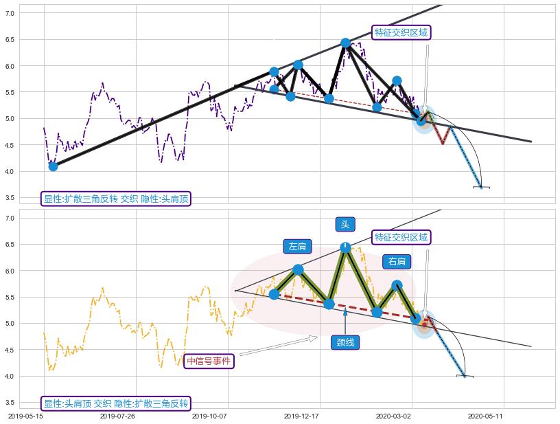 ➣ 【未确认突破,预测即将形成突破】【扩散】三角形反转起点:2019-05-22, 预测突破点:2020-03-18,形态共208交易日