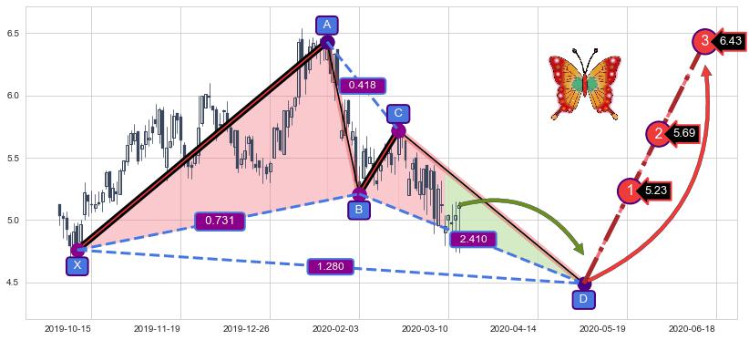 ➣ 未完成【蝴蝶】形态起点X: 2019-10-09, 已到达C点: 2020-02-19, 预测最终D点: 2020-05-01, 共139交易日