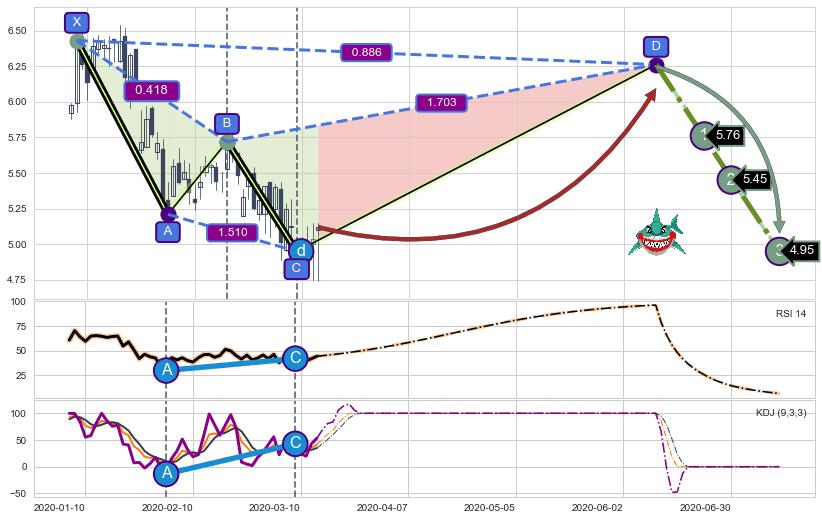 ➣ 未完成【鲨鱼】形态起点X: 2020-01-08, 已到达C点: 2020-03-09, 预测最终D点: 2020-06-10, 共109交易日