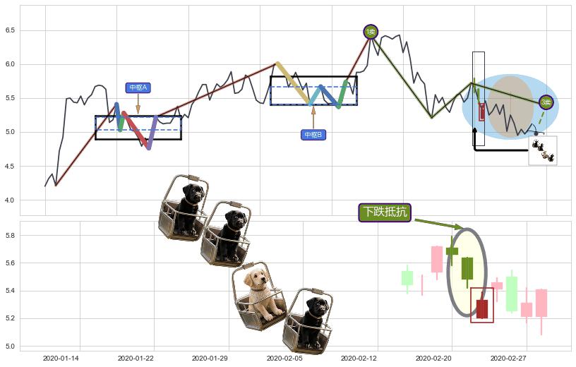 ➣ 【中枢B】:2019-11-29-2019-12-27,中枢由5笔构成,共20交易日, ZG=5.67, ZD=5.41