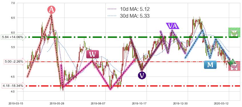 ♘ 阻力价格位5.84,可信任强度93.66%,距离最后交易2020-03-13形成的收盘价格5.12相差 +14.06%