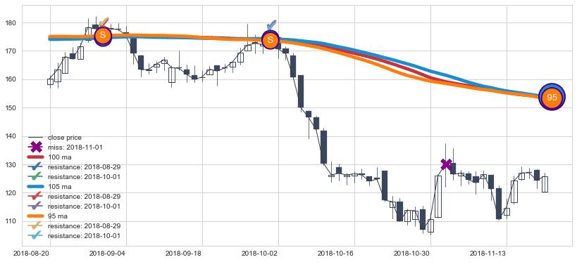 下跌趋势2018-08-20-2018-11-20,均线105, 100, 95确认关键阻力2处