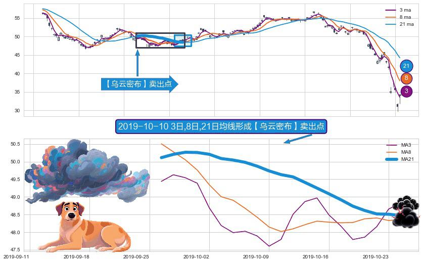 ⚀ 2019-09-26日-2019-10-24日显现 3日-8日-21日均线 【乌云密布】卖出点 看空信号,后市看跌,卖出