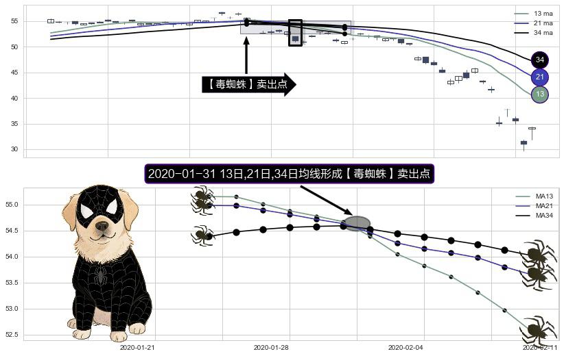 ⚀ 2020-01-31日显现 13日-21日-34日均线 【毒蜘蛛】卖出点 看空信号,后市看跌,卖出