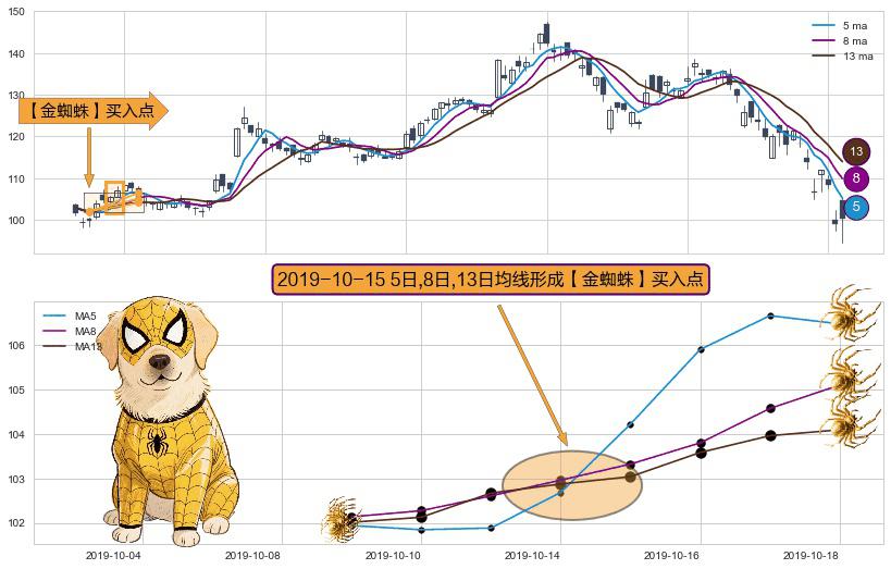 ⚀ 2019-10-15日显现 5日-8日-13日均线 【金蜘蛛】买入点 看多信号,后市看涨,买入