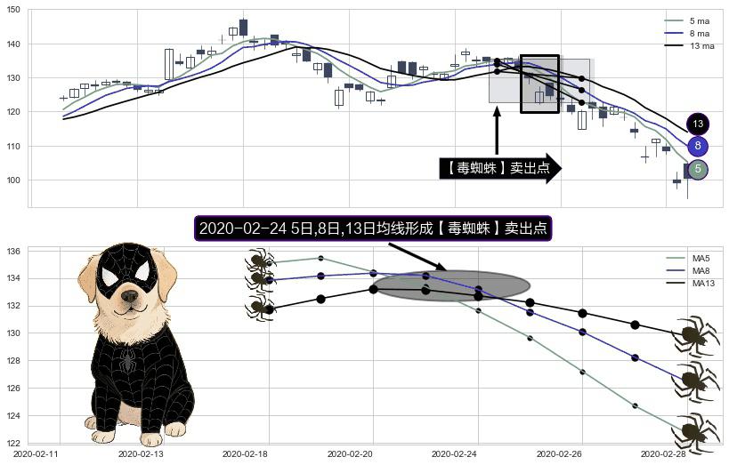⚀ 2020-02-24日显现 5日-8日-13日均线 【毒蜘蛛】卖出点 看空信号,后市看跌,卖出