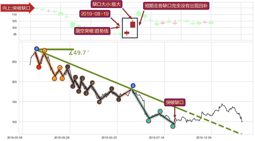 从2018-06-15至2019-09-10,共包含311个交易日,阶段股价下跌-82.05%,阶段股价变动位移路程比: 1 : 6,下跌趋势角度: 49.7