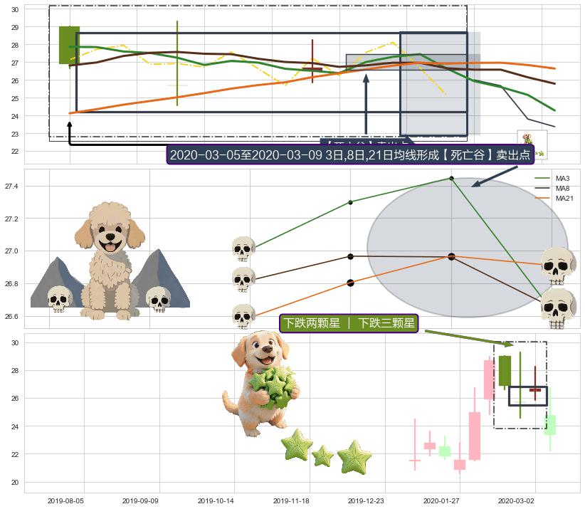 | 4 🅚:下跌两颗星 | 下跌三颗星 ➕ 🎢:【断头铡刀】卖出点均线组合卖出点信号形成后,猜想后续支撑破位,后市持续下跌 ☞ 看空信号 ⇥ 【均线】交织【🅚线】⇥ 综合量化分数: 44 | > |