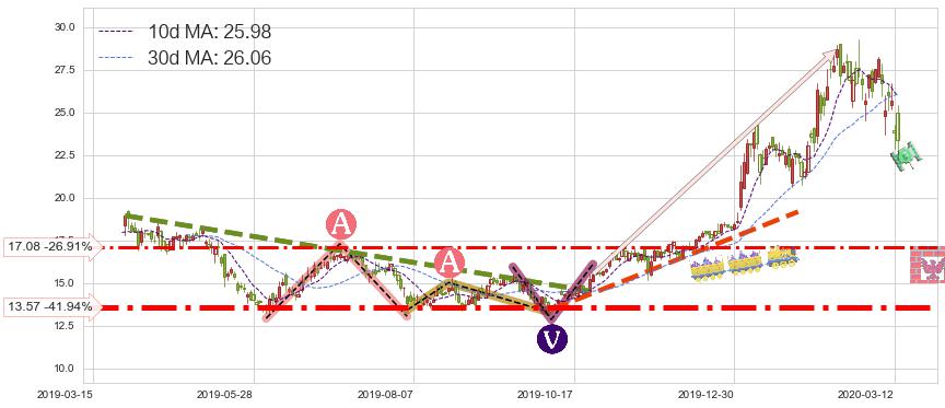 ♘ 支撑价格位17.08,可信任强度69.95%,距离最后交易2020-03-13形成的收盘价格23.37相差 -26.91%